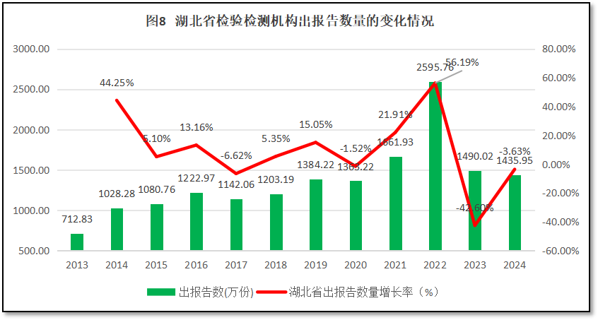 从图8来看,在2022年之前,湖北省检验检测机构对外出具的检验检测报告数量逐年波动增长,到2022年达到2595.76万份的峰值。2023年大幅下降,2024年进一步下降,为1435.95万份,是2013年出报告数量的2.01倍。从增长率曲线来看,湖北省检验检测机构出具报告数量的年均增幅为9.7%,年度最高增幅出现在2019年,达到45.52%的增幅,最低出现在2023年,为-42.6%。