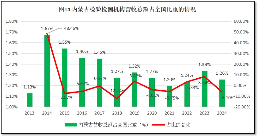 由图14可见,内蒙古自治区检验检测机构营收总额在全国检验检测行业营收总额中的比重从2013年的1.13%增长到2014年的1.67%之后就开始下降,到2021年占比降到1.2%,此后又微微上升,到2023年占比为1.34%。2024年,占比再次下降,回落到1.26%。从增长率曲线来看,刨除2014年异常数据,从2015年以来,虽然内蒙古自治区检验检测机构营收总额占比的增长率也有一些反弹的年份,但多数年份为负数,11年来的年均增幅为-2.66%,下降比较明显,说明内蒙古检验检测机构经营状况不佳,在全国的地位和贡献持续降低。