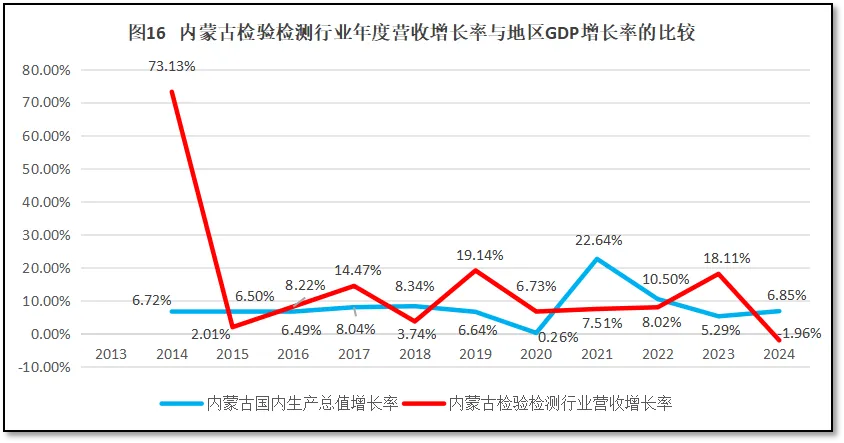 由图16可见,刨除2014年的异常数据之外,内蒙古自治区检验检测机构年度营收总额的增长率在2015年之后总体保持快速增长,年均增幅保持在8.6%左右,比同期其区域GDP的年均增速8.1%略高。但2024年度出现的较大降幅,不仅拉低了内蒙古自治区检验检测机构年度营收总额的年均增幅,还暴露了内蒙古检验检测行业由于机构数量过大,发展欠账太多,效益有限,发展存在较大困难的现实。