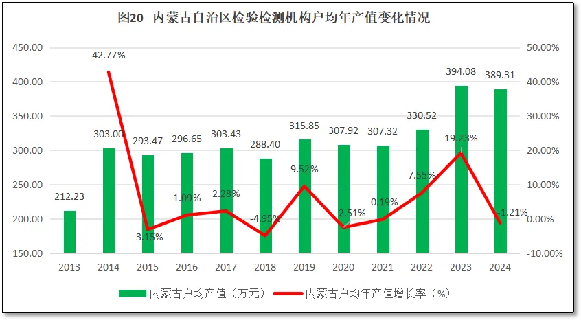 由图20可见,内蒙古自治区检验检测机构户均营收从2013年的212.23万元增长到2014年的303万元后,就几乎没有增长,一直在300万元左右徘徊,直到2023年才又出现了一次较大增幅,2023年末的户均营收达到394.08万元,是2013年的1.86倍。不过,2024年内蒙古检验检测机构户均营收出现微弱下跌,没有保持住进一步增长的势头,但好在下降幅度不大,维持在了389万元左右的水平上。从增长率的曲线来看,除了头两年数据误差导致增长率异常之外,内蒙古自治区检验检测机构户均营收最高增长率出现在2023年,达到19.23%。2015年以来内蒙古自治区检验检测机构户均年产值仅有2.76%的年均增幅,增长不大。这些数据说明,内蒙古自治区检验检测机构受限于区域经济不景气,其营收增长非常缓慢,近年来增速有提升的趋势,但后劲乏力,没有形成持续增长的局面。