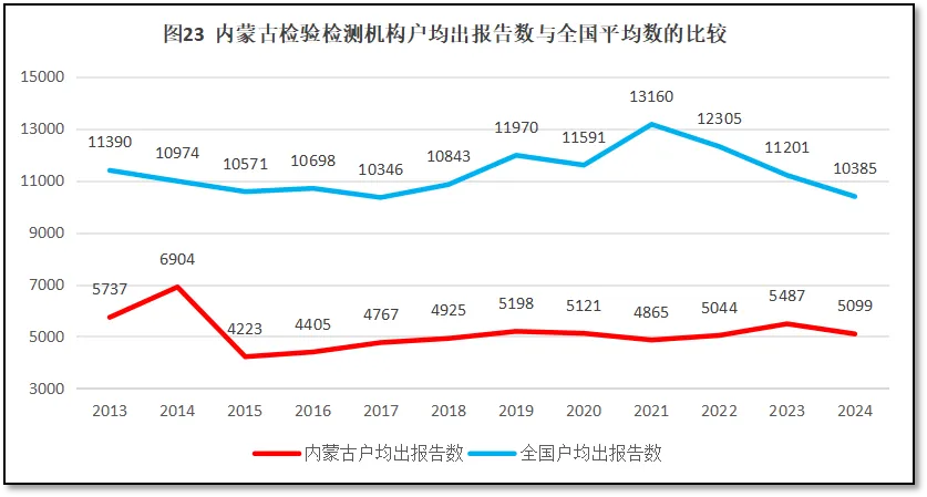 2024年度,内蒙古自治区检验检测机构户均出具检验检测报告5099份,是全国平均水平10385份的49.1%,全国排名第26位,与2023年度排名持平。从2013年以来,内蒙古自治区检验检测机构户均出具检验检测报告数量与全国的比较如图23所示。